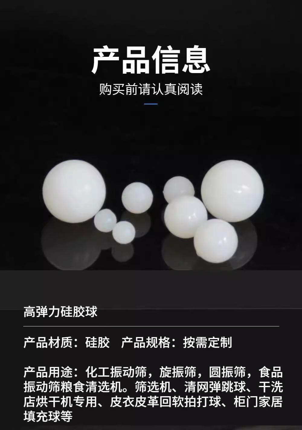 安裝在旋振篩的沖孔板與篩網之間,當旋振篩工作時,硅膠球利用自身的彈力和重量,隨著篩體的振動而產生跳動,不斷地撞擊篩網,使粘在或卡在篩孔之間的物料被拋起并落下,從而實現清網功能,提高物料的透網率和篩分效率。 應用領域 廣泛應用于食品、醫藥、化工、礦產、機械、金屬冶金等行業。例如在食品行業篩分面粉、糖粉等物料時,硅膠球的環保特性可確保產品不受污染;在醫藥行業篩分藥品顆粒時,能保證藥品質量安全。 外觀特點 硅膠球通常為乳白色的透明或半透明球體,外表光滑圓潤,手感適宜,彈性好,韌性足,這種外觀特性有助于其在篩網間順暢跳動,同時也便于觀察其磨損情況,及時進行更換。